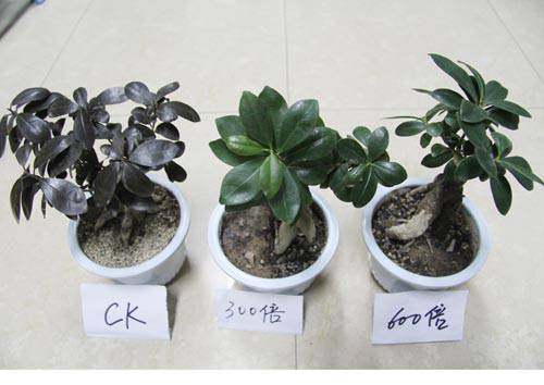上图为榕树使用勃生第四态能量源抗冻试验对比效果,从左到右依次为清水对照、勃生300倍稀释液和600稀释液。