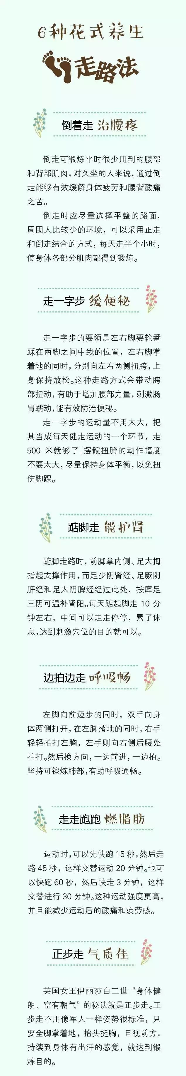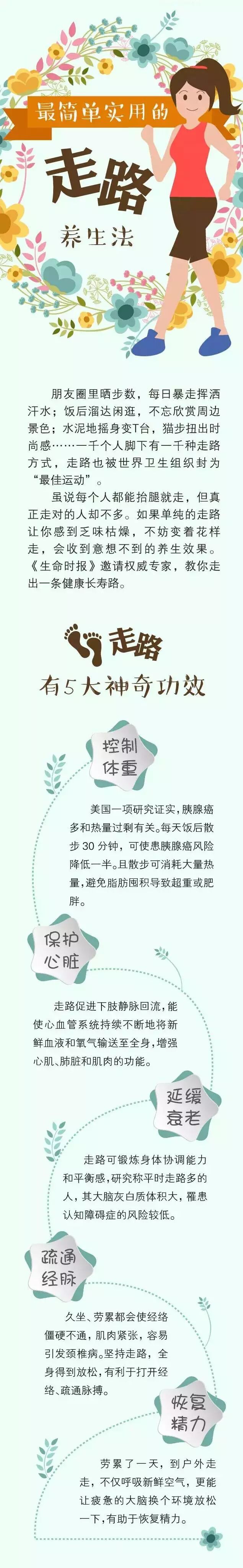 专家们认为,每天散步30分钟可以摆脱“成人病”的危险。每天走一万步的人,患心脑血管病的几率会下降60%。