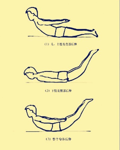 在硬床上,取俯卧位,脸部朝下,双臂以肩关节为支撑点,轻轻抬起,手臂向上的同时轻轻抬头,双肩向后向上收起(肩胛骨收缩)。与此同时,双脚轻轻抬起,腰底部肌肉收缩,尽量让肋骨和腹部支撑身体,持续3~5秒,然后放松肌肉,四肢和头部回归原位休息3~5秒再做。每天可做30~50下。刚开始时,可先做10~20下,逐渐增加。