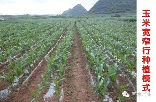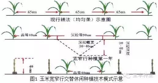 玉米宽窄行种植技术,把现行耕法的均匀垄(65cm)种植,改成宽行90cm,窄行40cm种植,玉米拔节前在90cm宽行结合追肥进行深松,秋收时苗带窄行留高茬(40cm左右)。秋收后用条带旋耕机对宽行进行旋耕,达到播种状态,窄行(苗带)留高茬自然腐烂还田。第二年春季,在旋耕过的宽行播种,形成新的窄行苗带,追肥期,再在新的宽行中耕深松追肥,即完成了隔年深松、苗带轮换、交替休闲的宽窄行耕种。