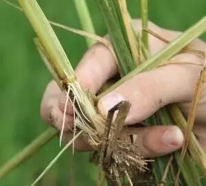 一般年份,恶苗病多出现在苗期,分蘖期后极少见病株,2015年,多地均报告有分蘖期后仍有大量恶苗病病株,除徒长外,也有与健株差别不大的类型,病情继续发展后,至孕穗期前后陆续枯死,下部茎节就可见数条白色逆生不定根,病轻的提早抽穗,穗形小而不实。抽穗期谷粒也可受害,严重的变褐,不能结实,颖壳夹缝处生淡红色霉,病轻不表现症状,但内部已有菌丝潜伏。症状与螟虫钻蛀或细菌性茎基腐病相似。