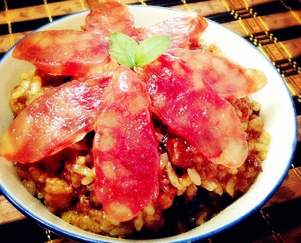 5.煮米饭的时候可以煮些香肠,放在饭上,装碗就开吃吧