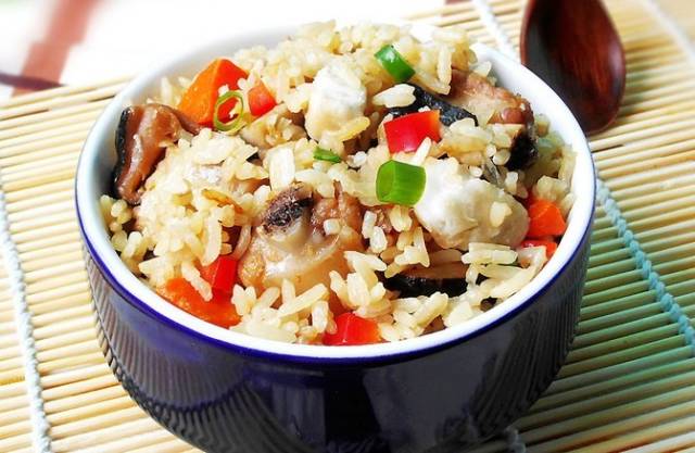 5.东北大米和圆糯米放在一起淘洗干净后,放入香菇丁和胡萝卜丁