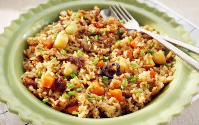 9.米淘洗干净~将炒好的食材倒入锅里,放入几朵洗干净的干香菇(不用泡发) 比平时煮饭多一点水,跳闸后继续多焖一会儿,尽量焖干一点,喜欢锅巴的可以多煮一会儿出锅巴。