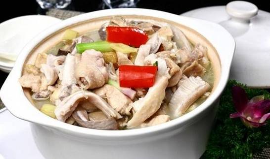 猪肚煲鸡,又名猪肚包鸡火锅、凤凰投胎。广东客家地区酒席必备的餐前用汤,汤里浓中带清,有浓郁的药材味和胡椒香气。顾名思义,猪肚包鸡火锅就是用生猪肚把生鸡包住,用水草(或用牙签)扎好二头后放到特配的汤料中煲熟,食前再将猪肚刮开,取出熟鸡一起砍件后,放回原煲汤料中滚热再食,这一食法是使生滚食法的火锅多了一种老火食法,节约时间的同时又可品尝到香浓扑鼻,美味可口的鸡肉,不用担心火候难以控制而鸡肉过火变韧。
