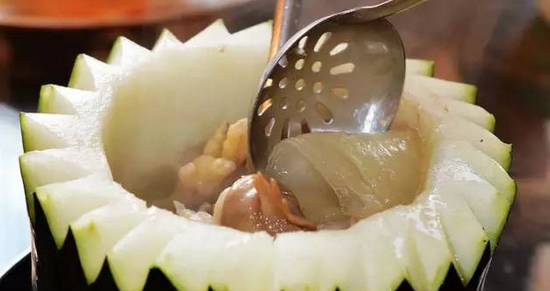 八宝冬瓜盅是夏令一种汤食。以冬瓜作为容器炖汤,故得此名。食时用勺子将瓜肉慢慢地刮出,同其他汤料混食,忌放酱油。此菜式美观悦目,清淡味鲜,为夏令之消暑佳品。