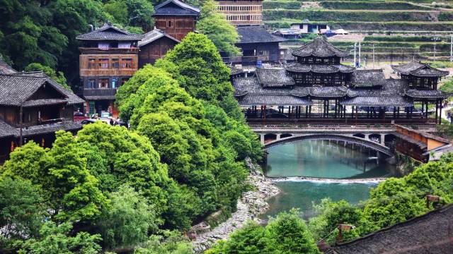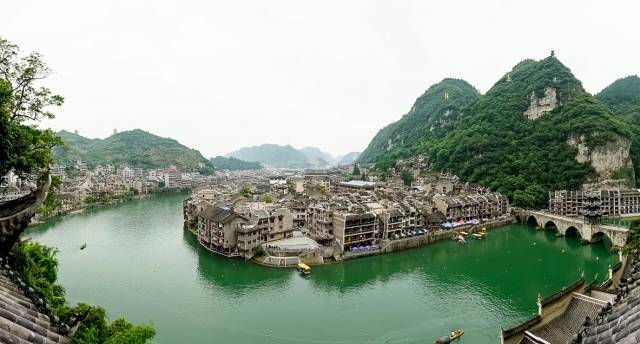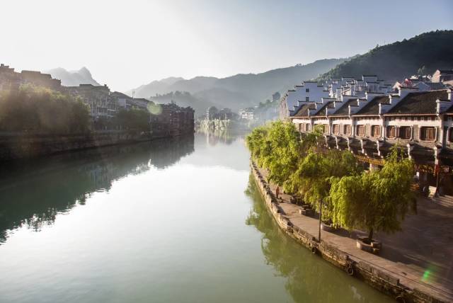 镇远古镇 镇远自汉高祖五年(公元前202年)设县开始,已有2200多年的历史,是云贵高原上历史最悠久的名城。 S形的河水绕城而过,将整个镇远古镇画成了一个八卦图案,人们临水而居,乘船往来。 这里是中国山地贴崖建筑文化博物馆,城内古街古巷曲径通幽,石桥城垣错落有致。 碧水晨雾姿态万千,春江渔火诗意盎然。