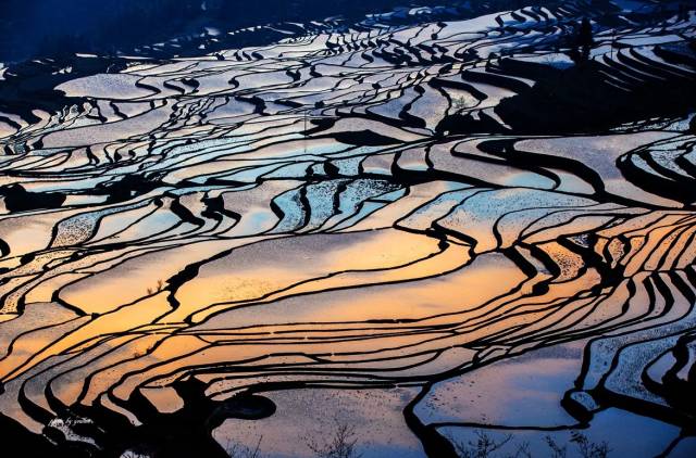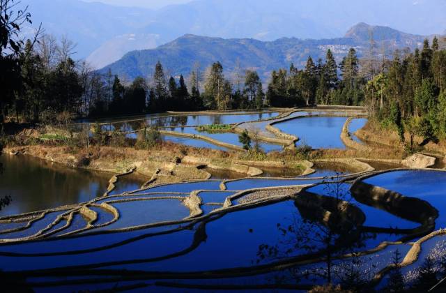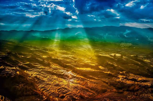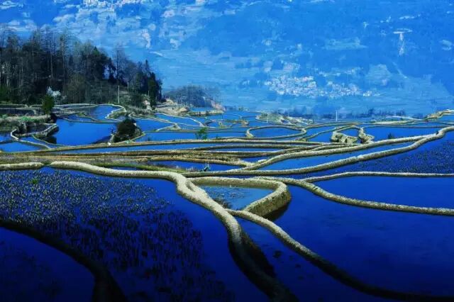 目光所及,近处灌水的梯田如镜面般晶莹,夺人心魄;远处阳光渲染下的梯田如洒落在大地上的蓝精灵,如梦似幻。