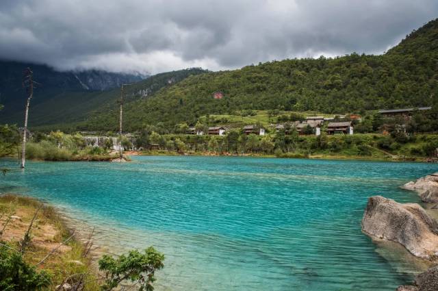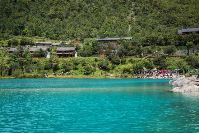 月牙形的山谷中有一汪蓝色的湖水,远看就像一轮蓝色的月亮镶嵌在玉龙雪山脚下, 这里就是蓝月谷。