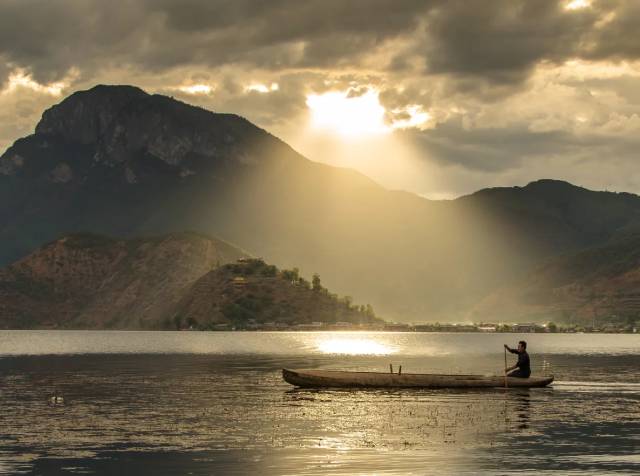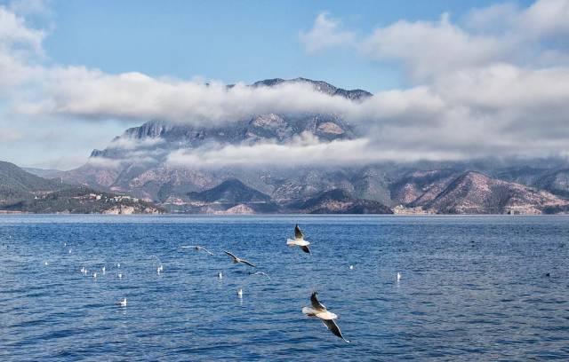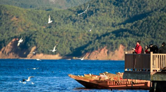 甘乘一只小船,做泸沽湖的点缀,畅游其中,和海鸥相伴。