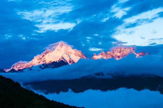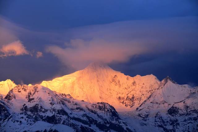 高山雪域风景位于海拔4000米以上, 云下岗峦碧翠;有时霞光辉映,雪峰如披红纱,娇艳无比。