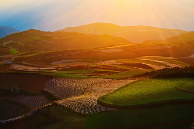 衬以蓝天、白云和那变幻莫测的光线,构成了红土地壮观的景色。薄雾轻拂,纱幔初开,大小村庄依稀可见,远近山岭尽收眼底。