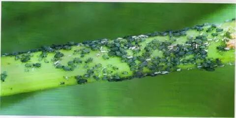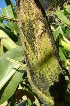 专家:成、若蚜群集于叶片背面、心叶、花丝和雄穗取食、能分泌“蜜露”并常在被害部位形成黑色霉状物,影响光合作用,叶片边缘发黄;发生在雄穗上会影响授粉并导致减产;被害严重的植株的果穗瘦小,籽粒不饱满,秃尖较长。此外,蚜虫还能传播玉米矮花叶病毒和红叶病毒,导致病毒病造成更大的产量损失。