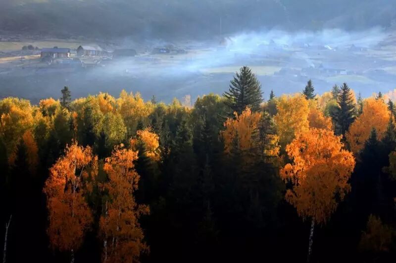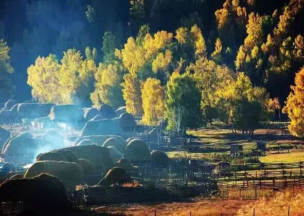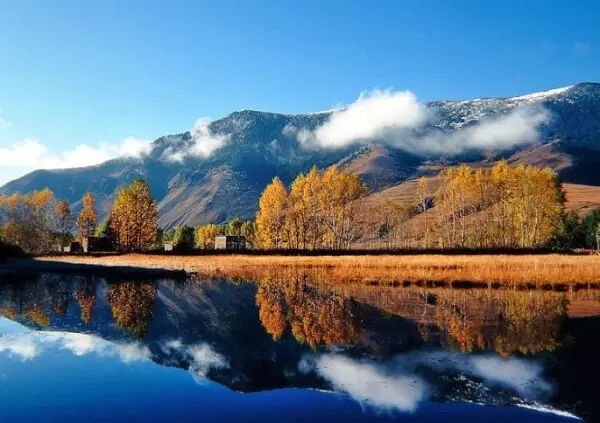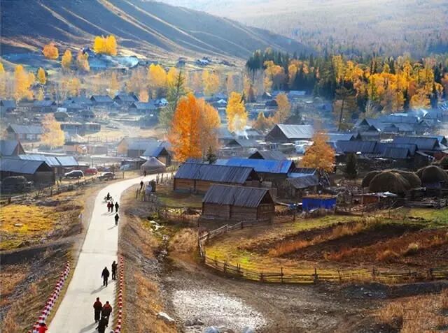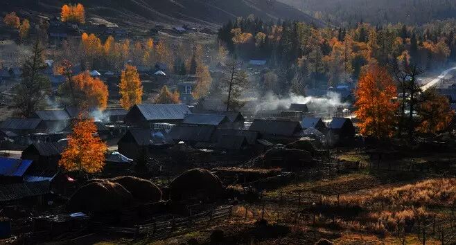 白哈巴村的秋天,是一个色彩斑斓的世界,只见河谷内的杨树叶是金黄的,山脚下桦树的叶子是火红的,落叶松的针叶下缘是淡黄的,山岗上的草甸一片褐红,白雪覆盖的雪峰,蓝天上飘着几朵云彩,这样的风景,犹如置身于一位印象派油画大师以大自然为画布,绘出的一幅令人叹为观止巨作——童话世界。