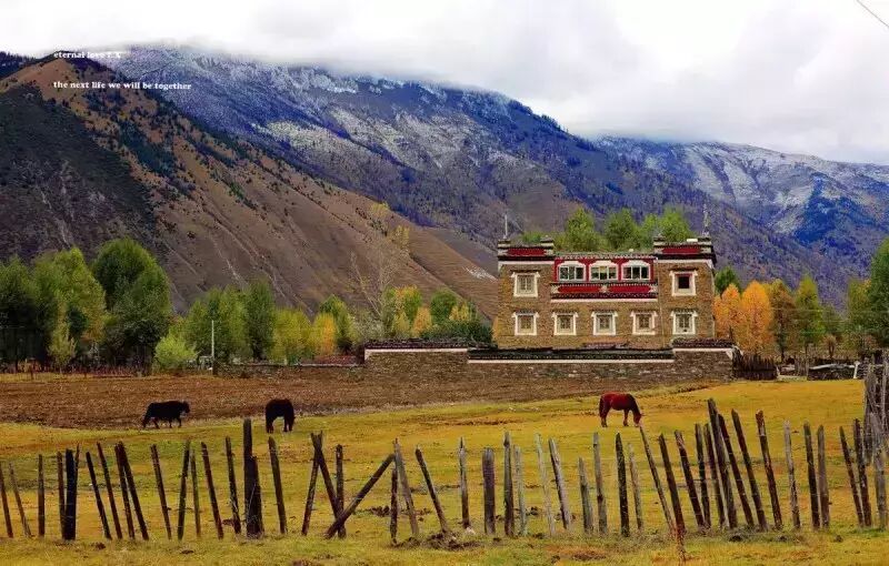 秋季,高原梨树掉叶子前会变成绚丽的黄色或红色,在变化万千的光影中与红白色藏房交相辉映。山顶则覆盖起了积雪,此时正是拍照的好时机。