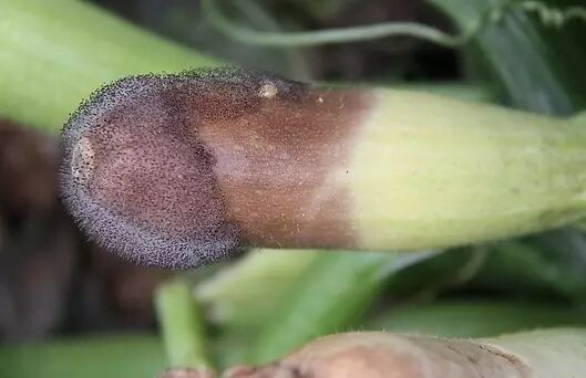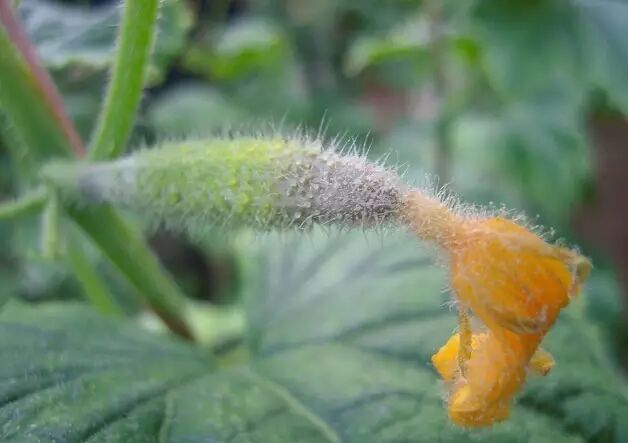 感染幼瓜快发展,密生灰霉幼瓜烂。
