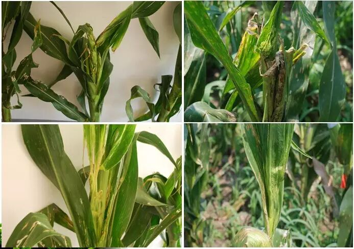 玉米苗期至成株期均会表现出症状,并出现不同程度的矮化;中上部叶片表现失绿、畸形、皱缩或扭曲;边缘组织呈刀削状缺刻,边缘黄化,沿主脉一侧或两侧形成黄化条纹;叶基部腐烂仅存主脉,后期雌穗小或不结实。