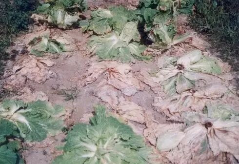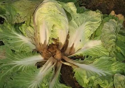 病菌从幼苗的根部直接侵入,整株生长迟缓,外叶呈萎蔫状,莲座期可见菜株于晴天中午萎蔫,但早晚能恢复。持续几天后,病株外叶平贴地面,心部或叶球外露,叶柄处或根茎处髓组织溃烂,轻碰病株即折倒。