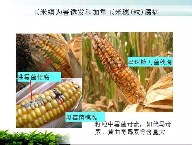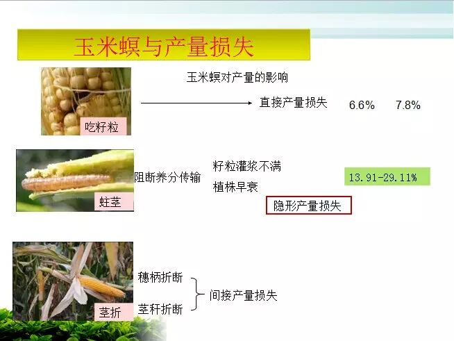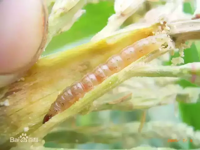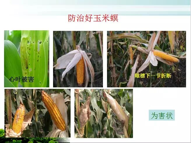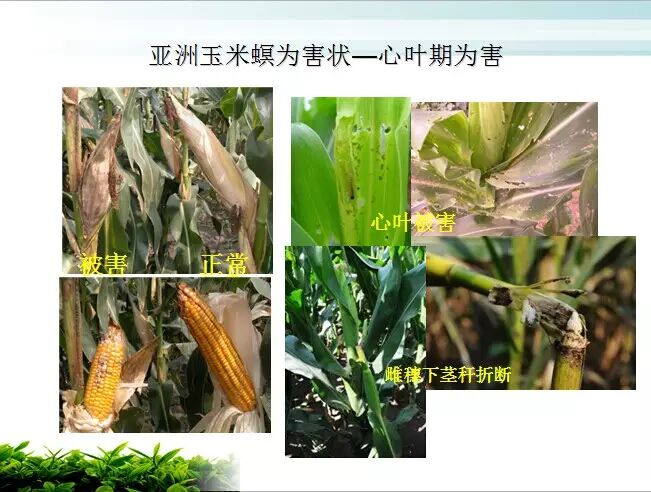 在玉米心叶期,初孵幼虫大多爬入心叶内,群聚取食心叶叶肉,留下白色薄膜状表皮,呈花叶状;2、3龄幼虫大多爬入心叶内潜藏为害,心叶展开后,出现整齐的排孔;此后,陆续蛀入茎秆继续为害,蛀孔口常堆有大量粪渣;雄穗被蛀,常易折断,影响授粉;苞叶、花丝被蛀食,会造成缺粒和秕粒;茎秆、穗柄、穗轴被蛀食后,形成隧道,破坏植株内水分、养分的输送,使茎秆倒折率增加,籽粒产量下降。初孵幼虫可吐丝下垂,随风漂移扩散到邻近植株上。
