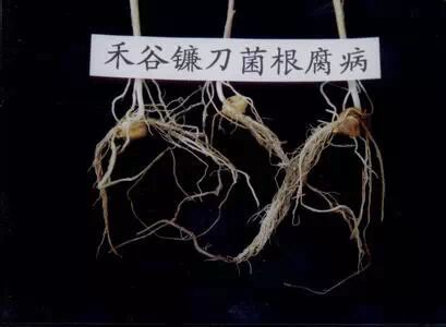 由镰孢菌引起的根腐病,主要表现为根系端部的幼嫩部分呈现深褐色腐烂,组织逐渐坏死;与籽粒相连的中胚轴下部发生褐变、腐烂;植株叶片尖端变黄,病害严重时导致植株死亡。