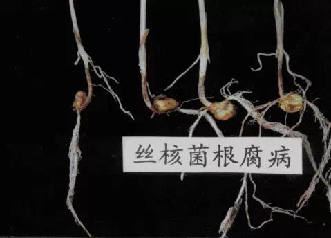 由丝核菌引起的根腐病,病斑主要发生在须根和中胚轴上,病斑褐色,沿中胚轴逐渐扩展,环剥胚轴并造成胚轴缢缩、干枯。病害侵染严重时,可导致幼苗叶片枯黄直至植株枯死。