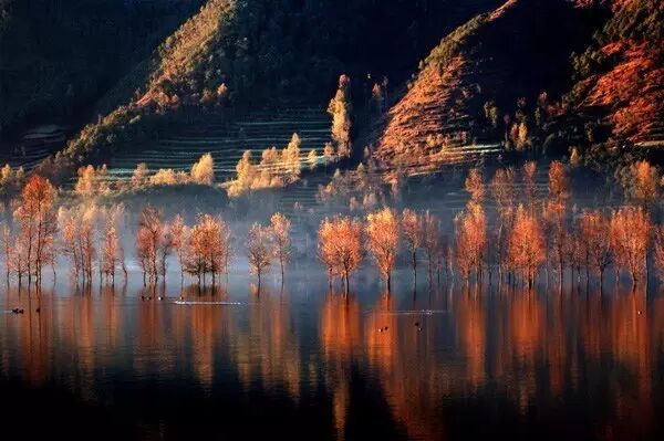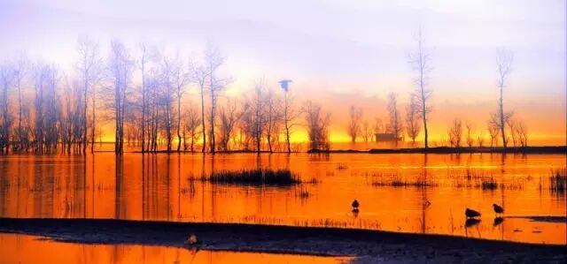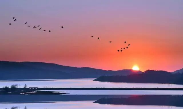 每年11月,大批水鸟来这儿过冬,静寂的山峦、深深的湖水、红色的土地、灵动的候鸟,在这儿展开一幅宁静和谐的画卷。