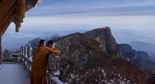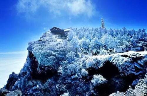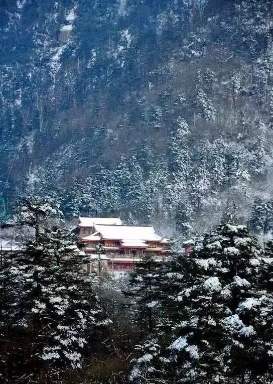 11月峨眉山降初雪,房屋顶、树林间、石阶上,处处薄粉装玉砌,皓然一色。