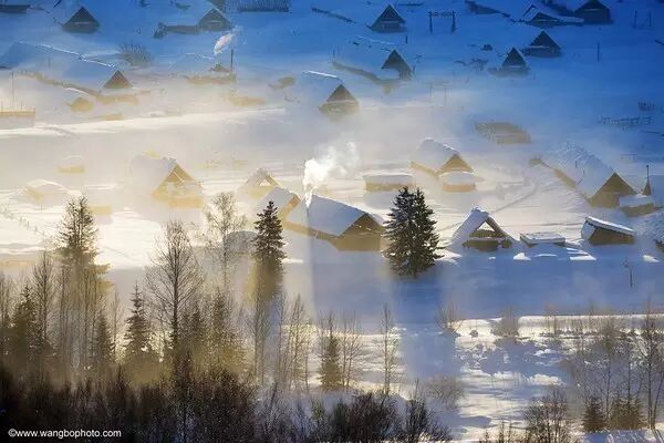 被白雪覆盖的村庄、树林、道路、山体与炊烟、起早的路人相互映衬,每一个结合都是一幅美丽的水墨画。