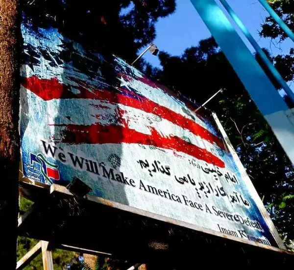 电影《逃离德黑兰》里美国大使馆外的标牌,注意看那标语,哈哈