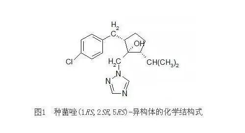 种菌唑为顺反异构体的混合物,是(1RS,2SR,5RS)-异构体(指羟基、苄基和异丙基在环戊环的同侧;顺式异构体)与(1RS,2SR,5SR)-异构体(反式异构体)约9∶1的混合物。种菌唑在欧盟登记的含量≥955 g/kg;其中,顺式异构体为875~930 g/kg,反式异构体为65~95g/kg。