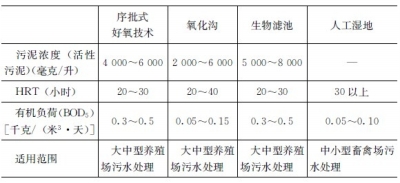 目前在国内畜禽养殖污水处理中,应用最多的好氧处理技术有序批式活性污泥法、活性污泥法、生物滤池和人工湿地等,其处理技术适用条件和工艺参数见下表。