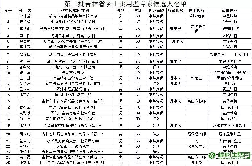 日前,网友云开见日从吉林农网了解到:按照《吉林省乡土实用型专家选拔管理实施办法(修订稿)》的要求,经过申报推荐、资格审查、专家评审、实地考察等环节,从全省131名申报推荐人选评选出25名“第二批省乡土实用型专家”候选人,榆树市青岳精品编织有限公司总经理李秀兰、吉林省陆路雪食品有限公司胡长明总经理有幸入选。