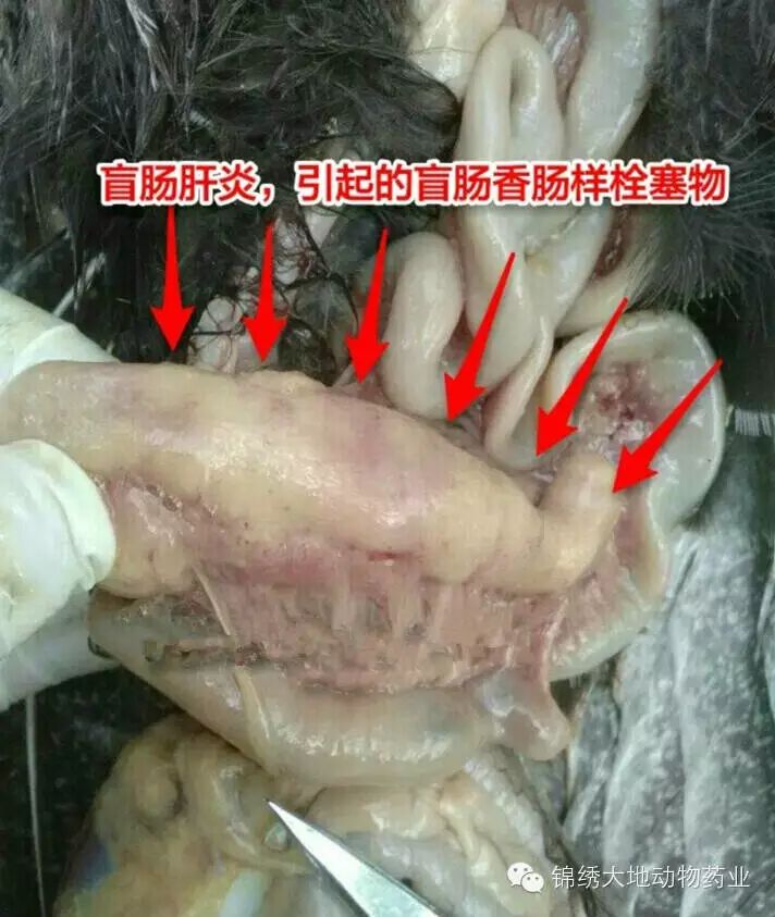 小肠内发现虫体。肠粘肠增厚,肠道有炎症,肠道有灰黄色的结节,中央凹陷,其内可找到虫体或黄褐色干酪样栓塞物!