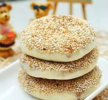 4.平底锅不放油加热,芝麻面向下,把面坯放入,小火烙制,两面烙制金黄,即可出锅。