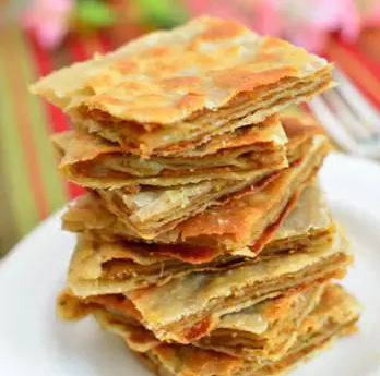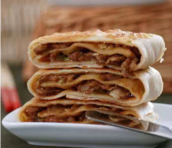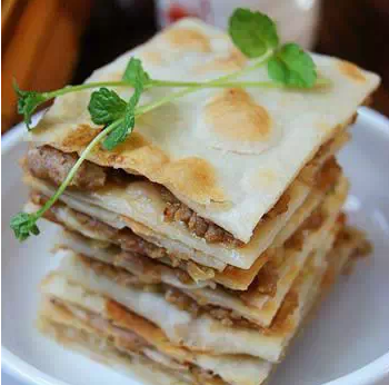2.面皮擀成一张大薄饼,分成四块,一块留空,其余的铺上肉馅儿,一层一层对折,把馅儿盖住,最后成一个扇形,封口;
