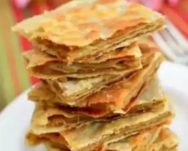 5.锅中倒入少许油,放入面饼改成小火,盖上盖子烙制,烙制双面呈煎金黄色即可,取出切块食用。