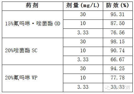 试验例:(1)张国生等对研制的15%氟吗啉·唑菌酯可分散油悬浮剂(OD)配方产品,进行了室内生物活性测定试验,结果列于表2。