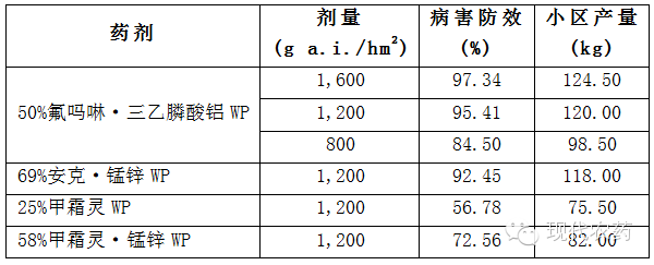 (2)马红丽等用50%氟吗啉·三乙膦酸铝WP对葡萄霜霉病的田间药效试验结果显示,有较好的防治效果,见表3。