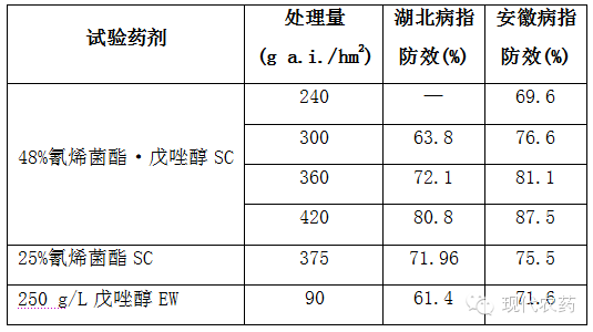 (2)刁亚梅等用48%氰烯菌酯·戊唑醇(36+12)悬浮剂防治小麦赤霉病田间试验,结果见表11。