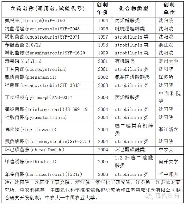 除了表1所列之外,国内还有一些创制的农药杀菌剂品种有:噻菌铜(Thiodiazole-copper,噻唑类化合物,浙江龙湾);菲啶毒清(NK-007,生物碱有机酸盐,南开大学);申嗪霉素(Meperfluthrin/M18,吩嗪类,上海交通大学);金核霉素(aureonucleomycin,农抗类,上海农药研究所);长川霉素(ascomycin,农抗类,上海农药研究所);氟苯醚酰胺(华中师范大学);中科(3号Zhongke 3 hao和中科6号Zhongke3 hao,寡聚糖类,大连化物所)等。