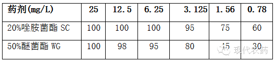 经离体试验结果表明,氯啶菌酯对稻瘟病、稻曲病、水稻纹枯病、小麦根腐病、番茄灰霉病、油菜菌核病和荔枝霜霉病等多种病害均有良好的抑菌活性。氟啶菌酯具有一定的根部吸收传导作用,在50 μg/mL剂量下灌根处理的防效为58.58%,低于相同剂量下25%嘧菌酯悬浮剂(100%),略低于12.5%腈菌唑乳油(77.61%),优于50%醚菌酯干悬浮剂(20.90%)。