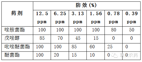 试验例:(1)20%唑胺菌酯SC经室内生测试验,根据其对小麦白粉病的EC90值与对照药剂50%醚菌酯WG进行了药效比较,结果见表4。