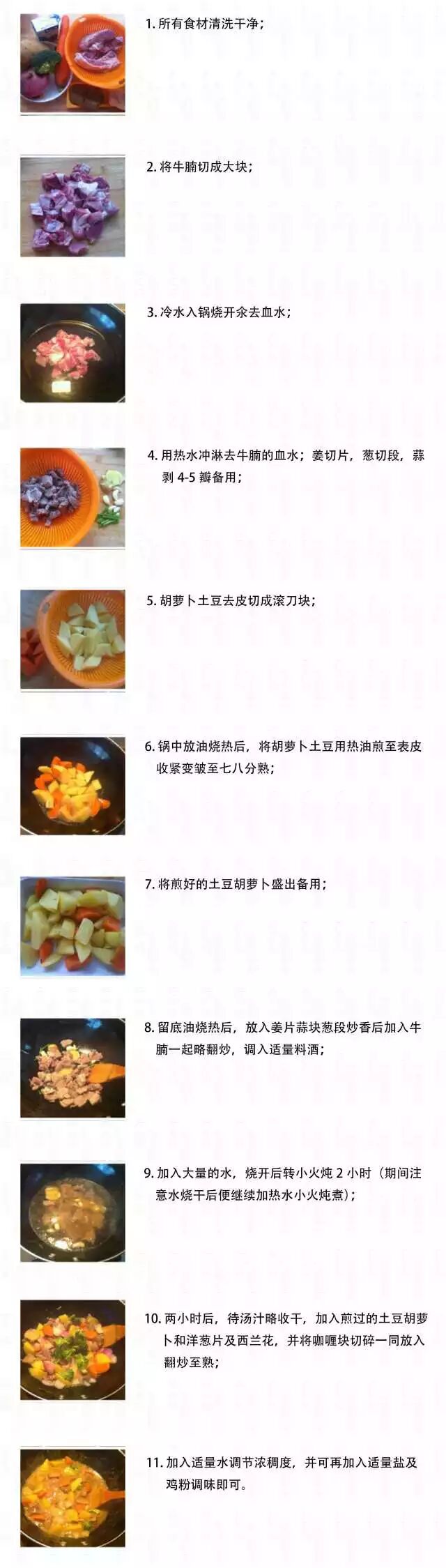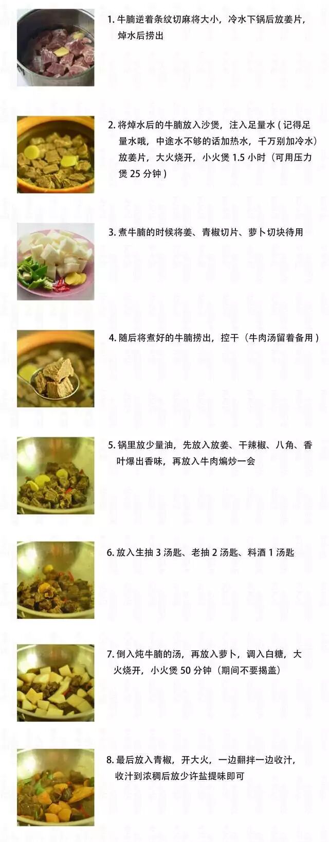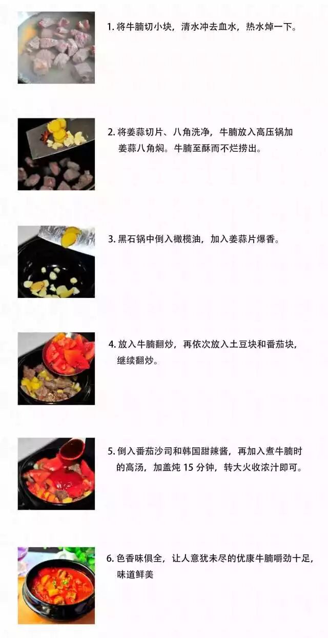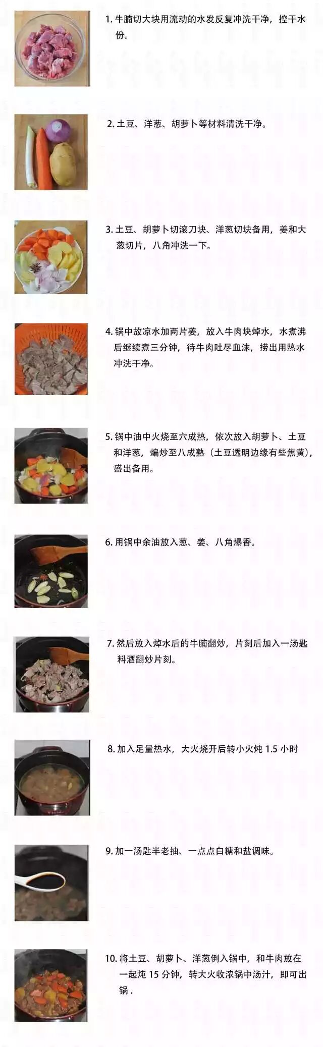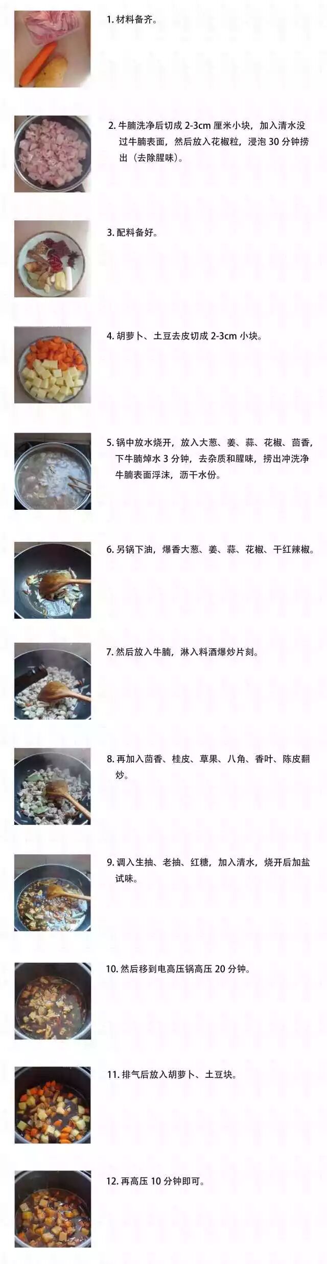 1、此菜有个做法很特别,就是把土豆和胡萝卜事先用油炒一下。2、土豆和胡萝卜用油炒过以后,表皮微微收紧,再炖煮的时候,口感更好,也不会有多余的粉粉的汤汁。1、炒制牛腩的过程中,边炒边淋入料酒,不仅能去腥,也能增加香气。 4、可以把高压锅炖好的牛腩放入沙锅里,然后再放入土豆和胡萝卜,慢火炖制味道更好。1.牛腩焯水的时候不要盖盖子,以利于腥味散发出去。2. 配料的土豆胡萝卜之类不要事先放入一起炖,因该先炒至八成熟,等牛腩炖酥后再放入锅中,调好味道一起炖15分钟左右即可。这样既可以吸收调味料的味道,又不至于因为事先放入和牛肉一起炖变得酥烂不成型。