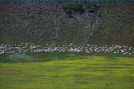 ♥扎鲁特山地的下午,一群羊走过山谷。