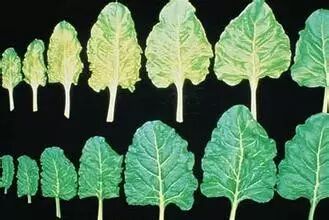 2、油菜:初始表现为植株浅绿色,幼叶色泽较老叶浅,以后叶片逐渐出现紫红色斑块,叶缘向上卷曲,开花结荚迟,花荚少小色淡,根系短而稀。