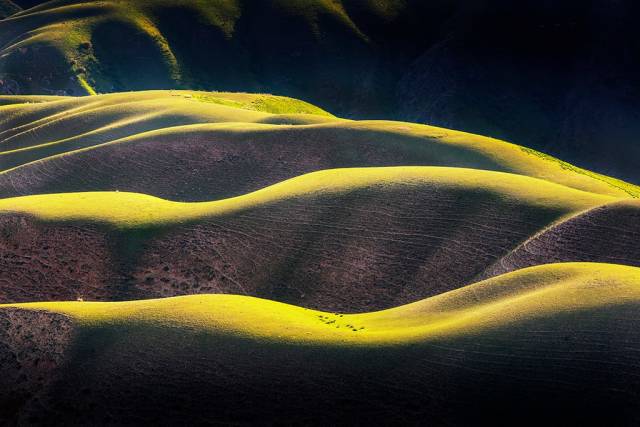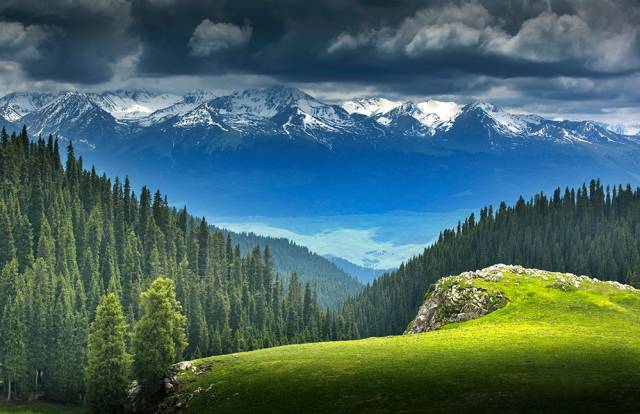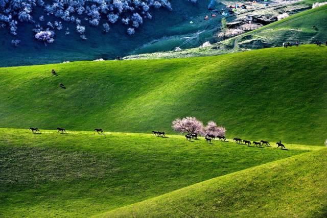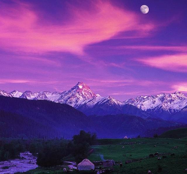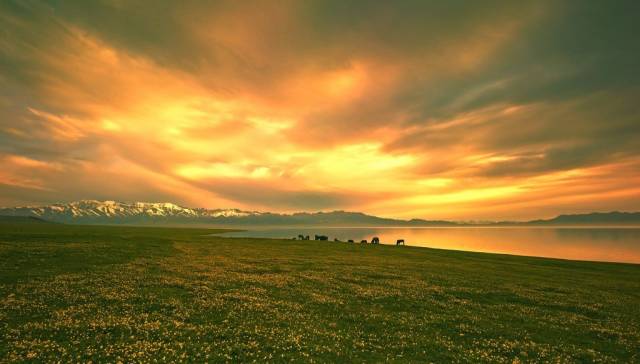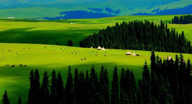 琼库什台草原,夏草如茵,漫漫的铺满到视线的尽头,舒缓的线条绵绵不绝得的与雪山相连,哈萨克的毡房犹如草原上滋生的白色蘑菇,成群的牛羊悠然自得“咩咩”散步。这是一幅多么美仑美幻的高山草原图画。