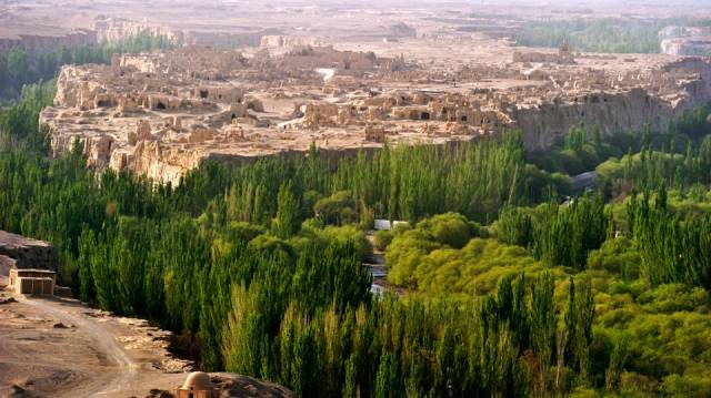 交河,是吐鲁番最古老的名称。交河故城坐落于吐鲁番西郊10km的雅尔乃孜沟的一个柳叶河心洲上,因两条绕城河水在城南交汇而得名。交河城是车师人所建,建筑年代早于秦汉,毁于14世纪前半叶元代的连绵战火。
