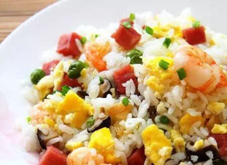 材料:虾仁、火腿、菜心、鸡蛋、剩米饭;虾仁用料酒、酱油、油、盐腌制20分钟。