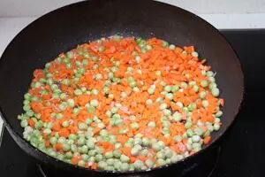 锅里放猪油一汤匙,把豌豆胡萝卜炒断生。