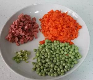 锅中放油烧热,依次放入香肠丁(三文鱼丁),胡萝卜翻炒几下,接着加入豌豆丁翻炒。